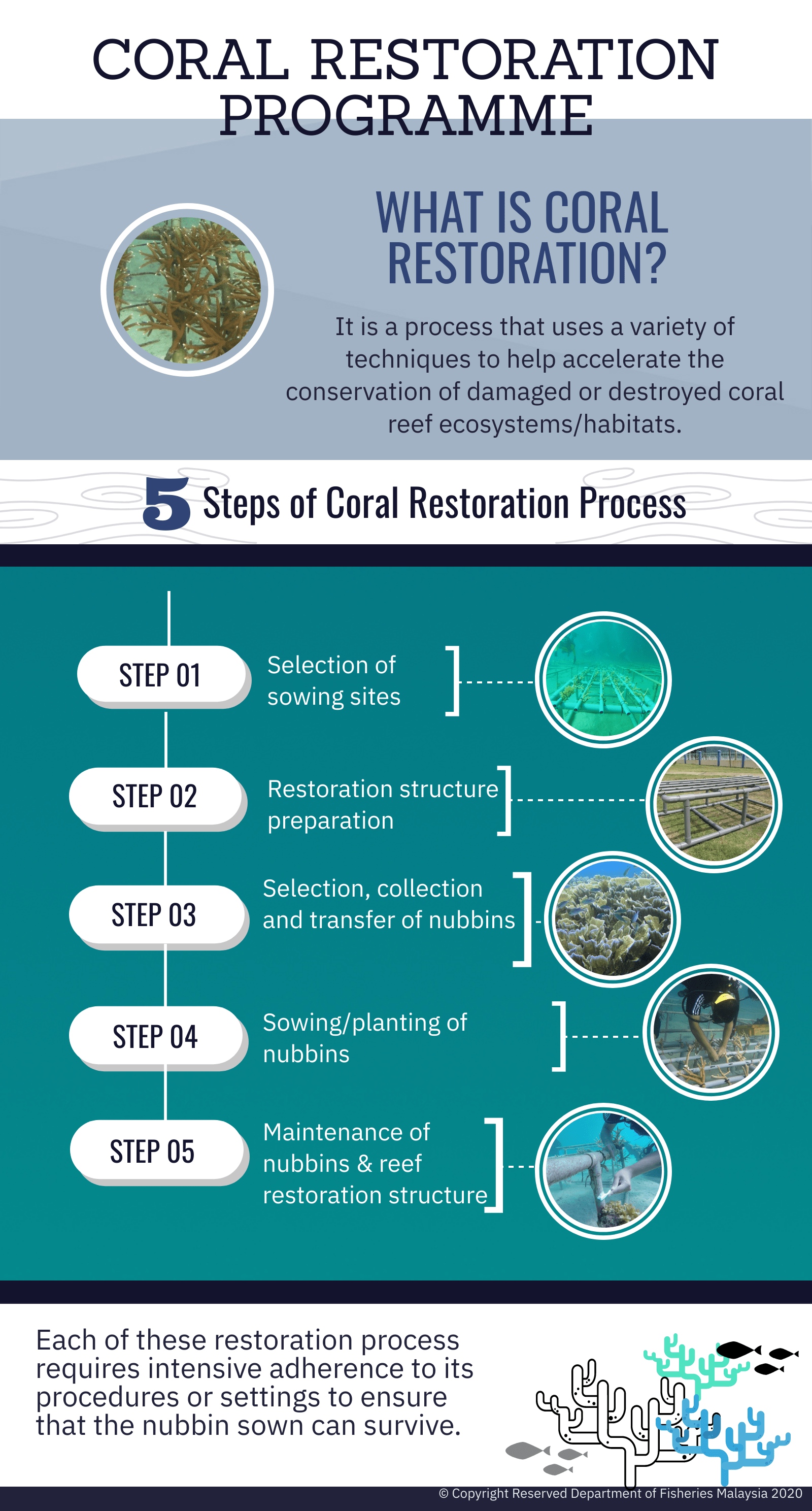 Coral restoration is a process that uses a variety of techniques to help accelerate the conservation of damaged or destroyed coral reef ecosystems or habitats. The Department of Fisheries Malaysia has taken the initiative to implement the Coral Restoration Programme to address the problem of loss and degradation of the marine habitat, especially in Marine Parks. It should be noted, however, that coral restoration programmes are not the only solution for conservation of damaged habitats. Identification and resolution of local threats should be given priority before a coral restoration programme can be implemented in a coral reef area to ensure the effectiveness and success of these programmes.