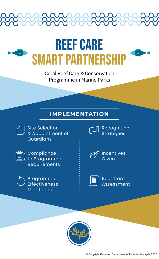 The Reef Care Smart Partnership programme is a care and conservation programme targeting several coral reef areas conducted in the Marine Park site (now conducted in Pulau Tioman, Pahang Marine Park). The programme is run by caretakers who consist of individuals or groups or local Malaysians, resort/chalet/boat operators who are appointed by the Department of Fisheries for this programme.