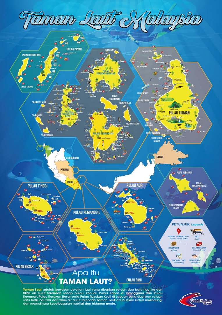 42 buah pulau telah diwartakan sebagai Taman Laut dibawah Bahagian ix -Akta Perikanan Malaysia 1985. Ianya berperanan sebagai kawasan perlindungan marin terutamanya ekosistem marin terumbu karang. Kepentingan pemeliharaan sumber Perikanan menjadi agenda utama negara memastikan kelangsungan Jaminan makanan Kita. Taman Laut ini juga menjana ekonomi melalui aktiviti pelancongan dengan nilai estetika seperti aktiviti selaman, panorama dan budaya. Sayangi Taman Laut Kita seperti Pulau Tioman di Pahang. Pulau Tioman seperti permata Lautan Sedunia yang mengagumkan dari kepelbagaian biologi darat dan lautan.