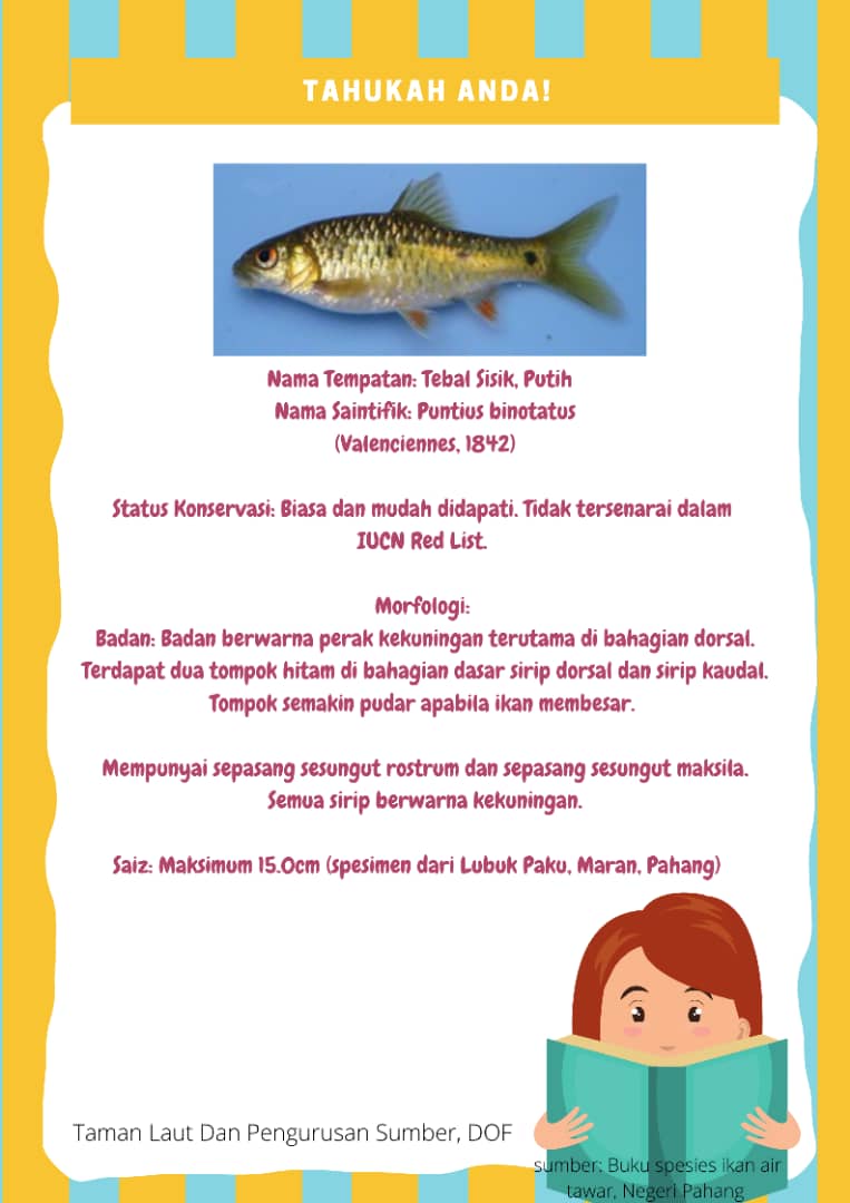 Ikan tebal sisik atau nama sainsnya Puntius binotatus boleh didapati di seluruh semenanjung terutamanya sebelah pantai barat Malaysia. Ia gemar mendiami anak-anak sungai yang mengalir perlahan. Ia boleh didapati di anak-anak sungai yang berhampiran dengan bukit. Ikan ini hampir pupus kerana habitatnya hampir musnah. Ia hidup dalam kumpulan kecil antara 10 hingga 15 ekor. Ikan ini tidak mempunyai nilai komersial kerana ianya bersaiz kecil dan banyak tulang. Pemeliharaan habitat terutamanya ekosistem sungai daripada ancaman pencemaran dan pemusnahan habitat ikan amat membimbangkan. Kita perlulah memastikan kelangsungan spesis ini agar tidak terancam dan hilang sebagai warisan biodiversiti kita.