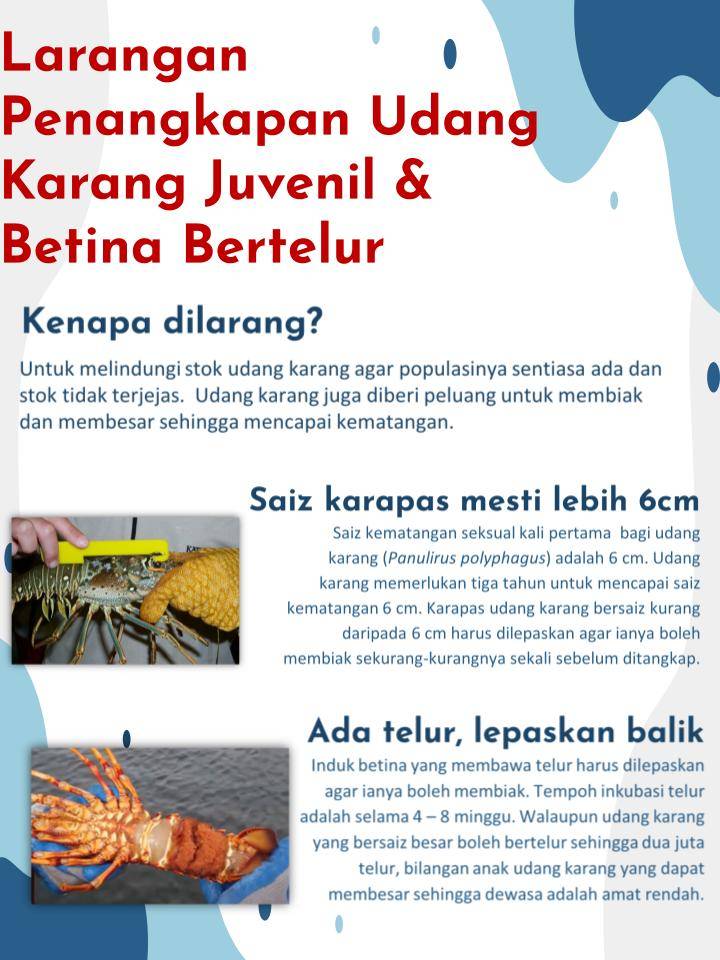 The refugia on the east coast of Johor and Kuala Baram cover an area of 17,784 km2 and 852 km2, respectively. The refugia approach is not an extension of the no-take zone. It is a set of specific actions specifically crafted to protect the targeted species. In the case of the mud spiny lobster, the DOFM takes three key steps,